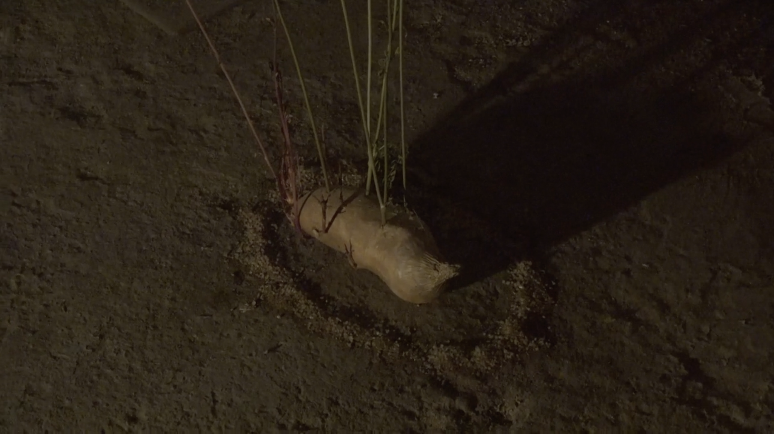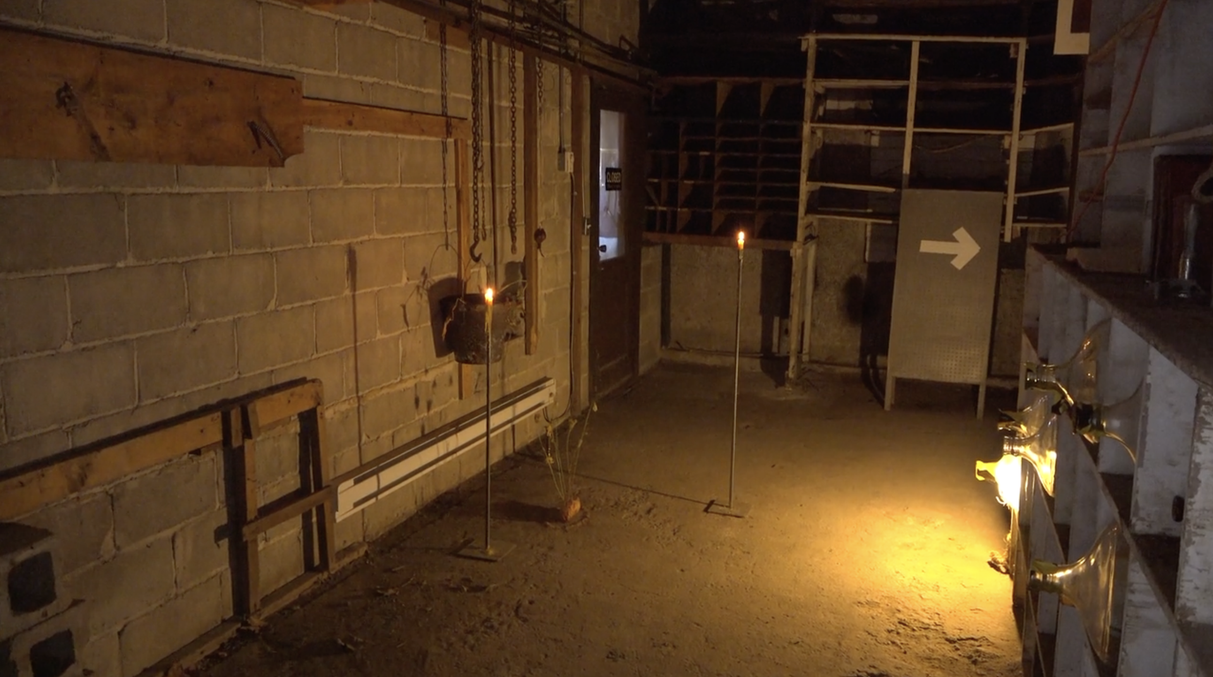 Sprouting sweet potato, cayenne pepper, salt, Queen Anne’s Lace, sprouting red onion, metal chain, lilypad, river water, single use plastic bag, beeswax candles